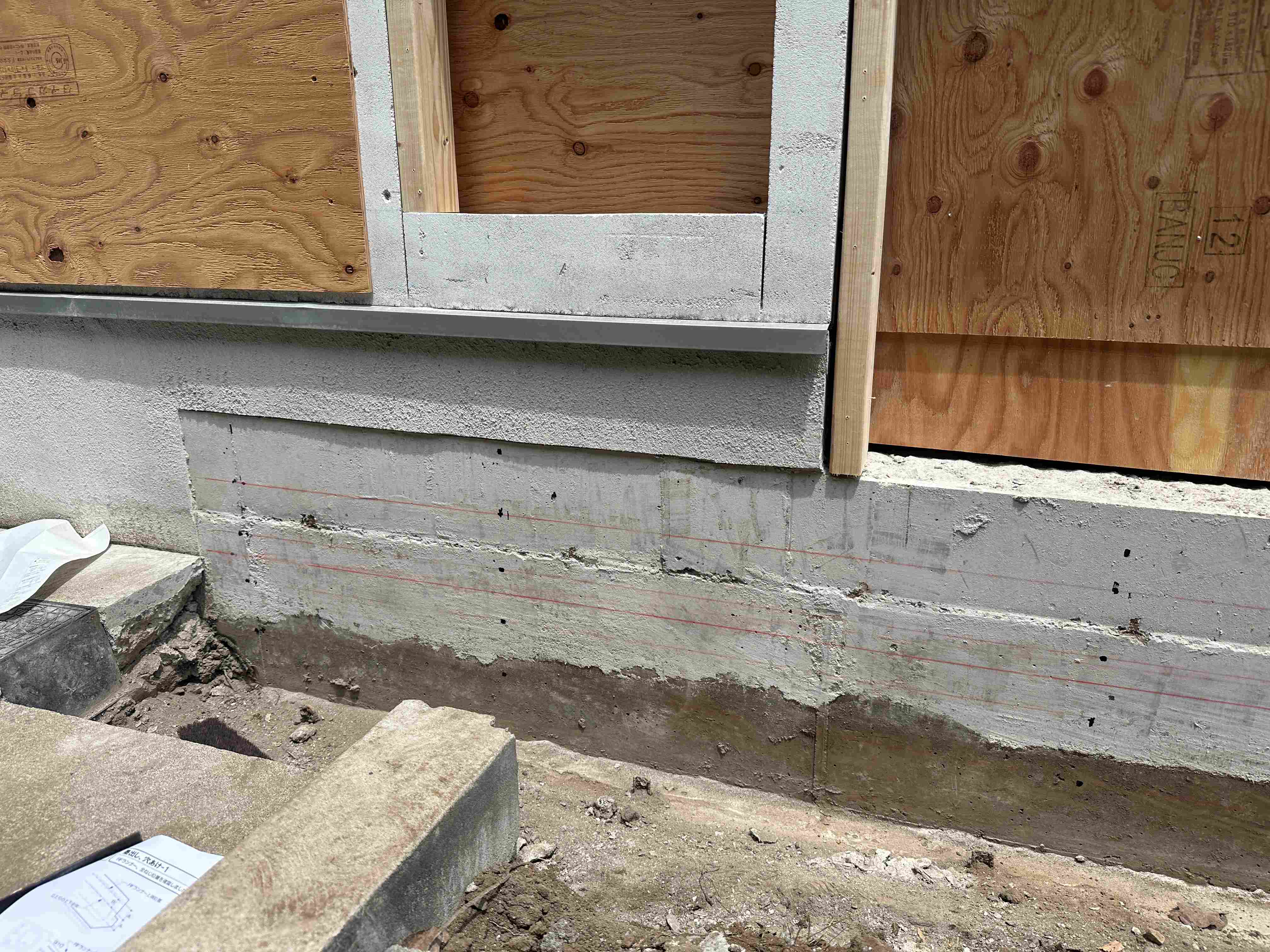 お打ち合わせ時に図面が無い事は確認していたので、建設した住宅会社に図面の有無等を確認して頂き、図面は無かったのですが基礎は有筋であると伺っていたのでその予定で工事を始めて風窓を斫ると鉄筋がありません、無筋基礎でした。
