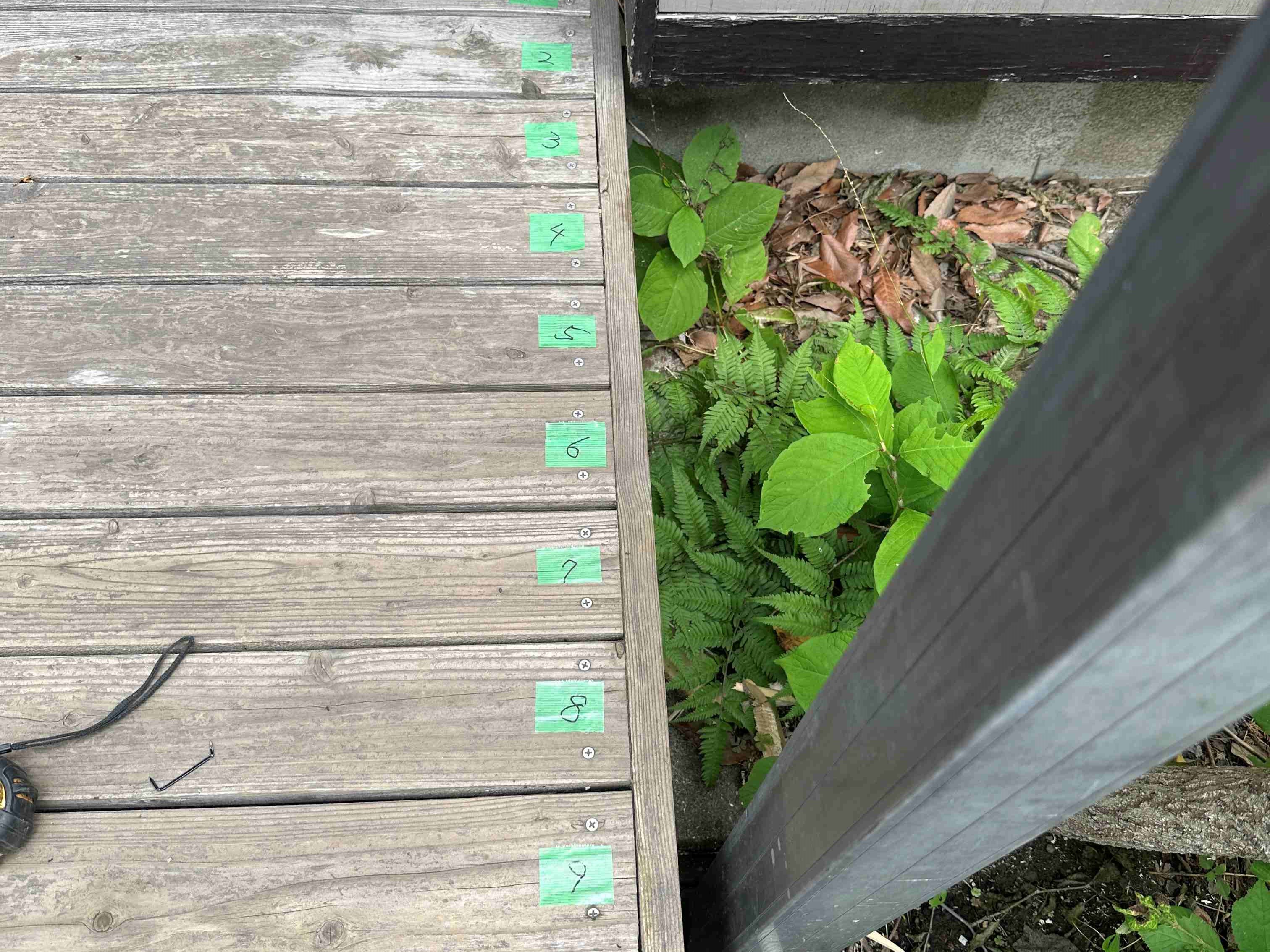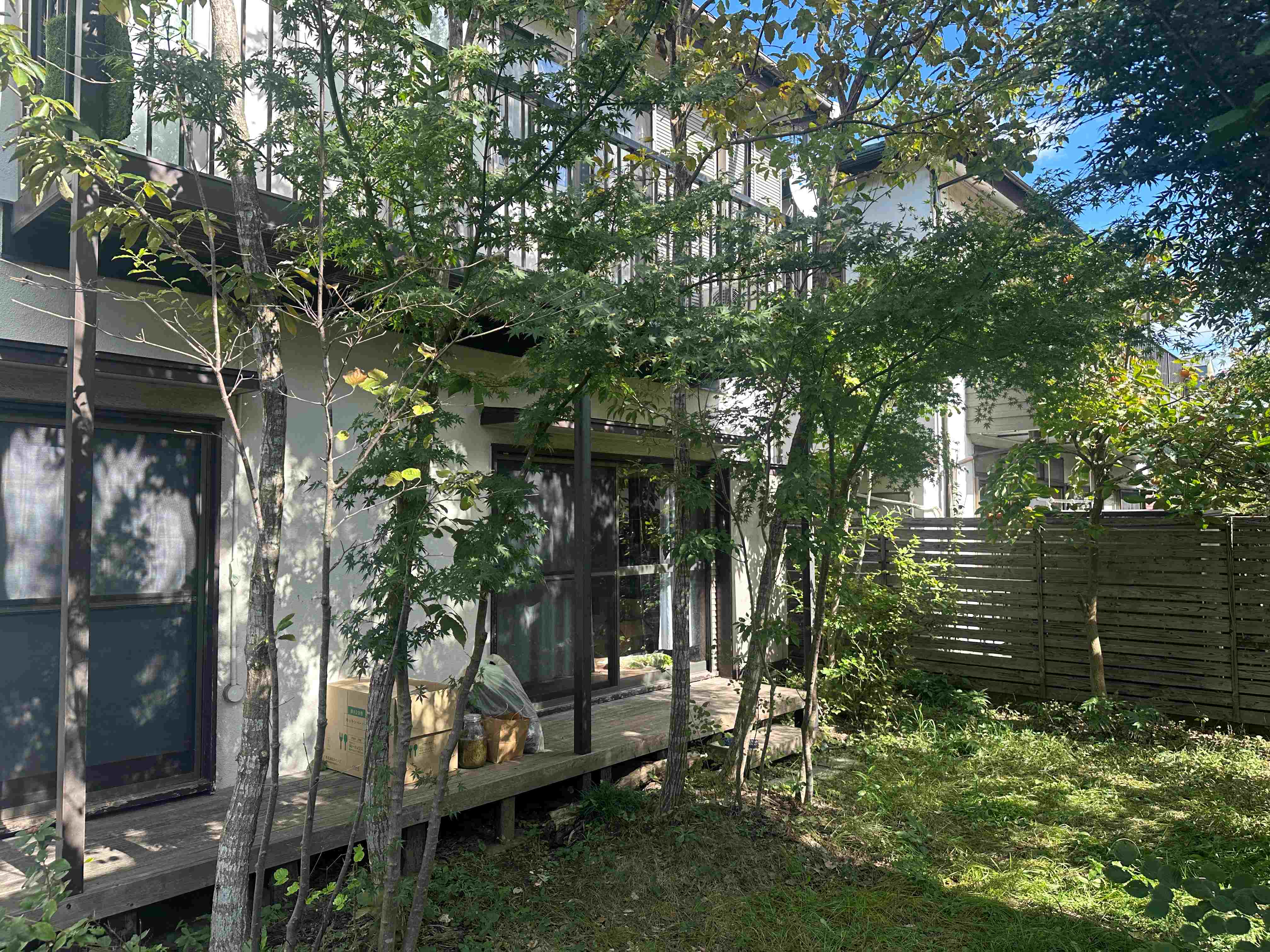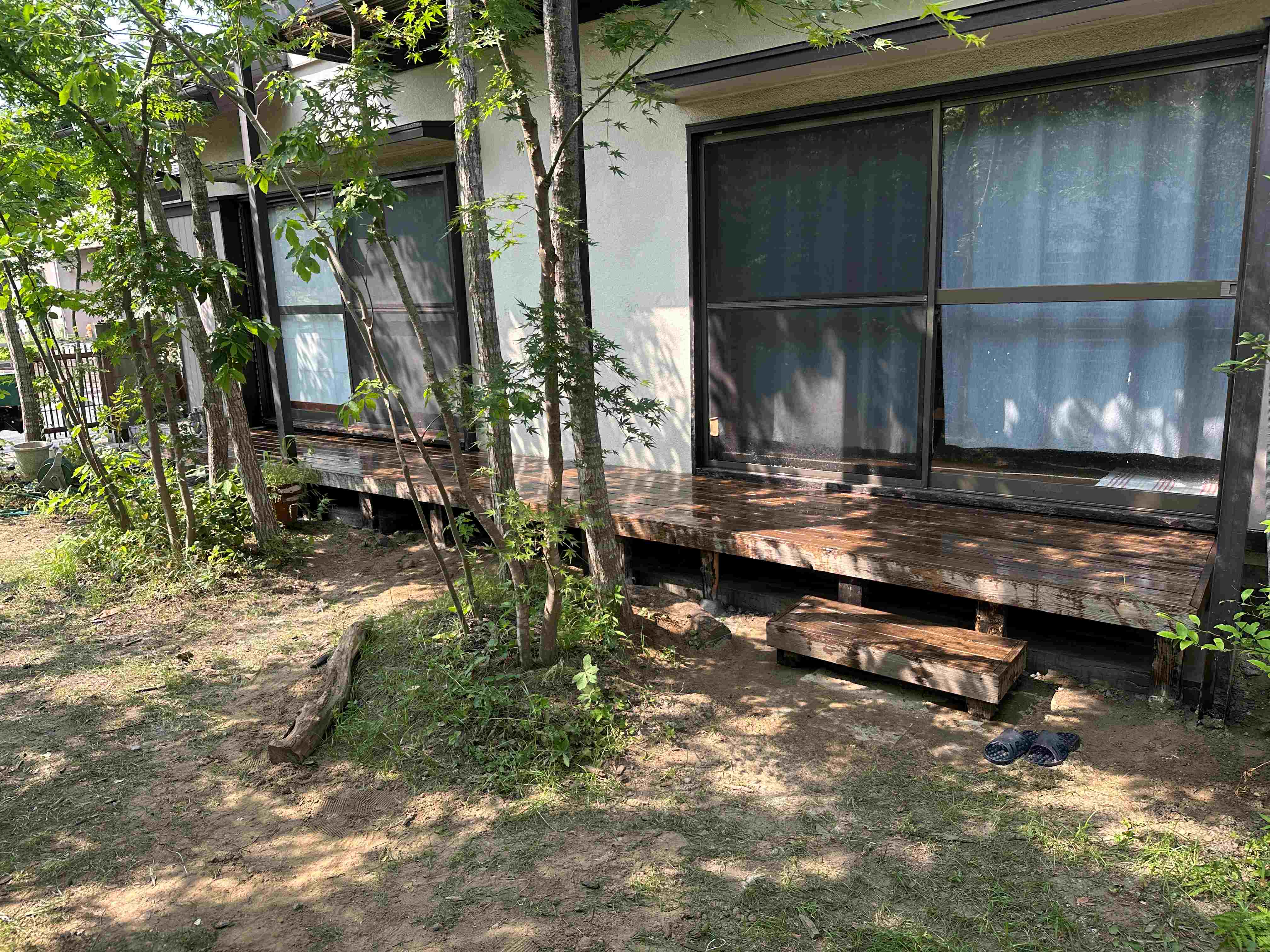 地盤調査時とは季節も変わり緑に囲まれて立派なお庭ですがウッドデッキの撤去から始めていきます。