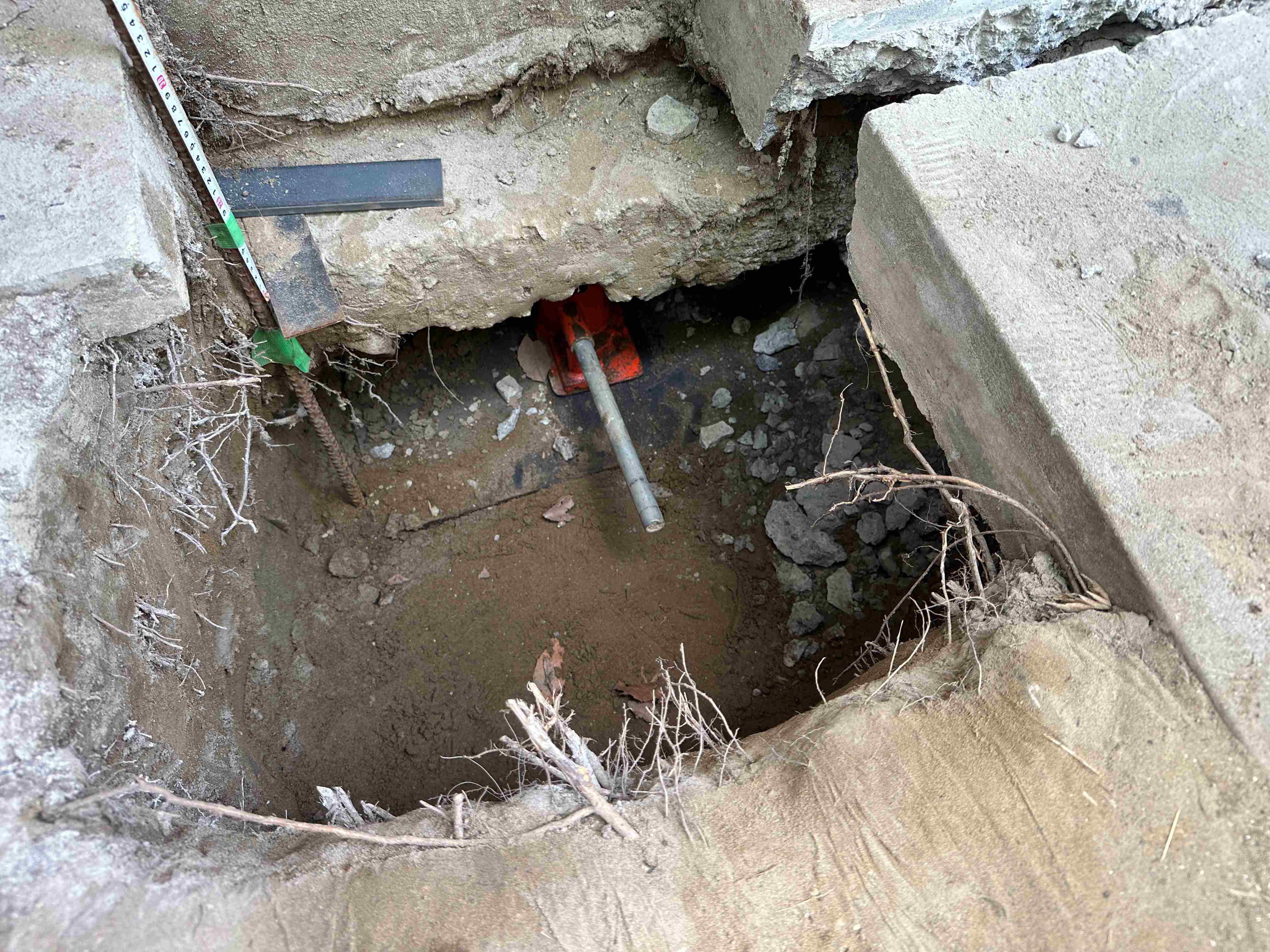 土間コンクリートの縁切り斫り作業をしながらジャッキセットをしていきます。
